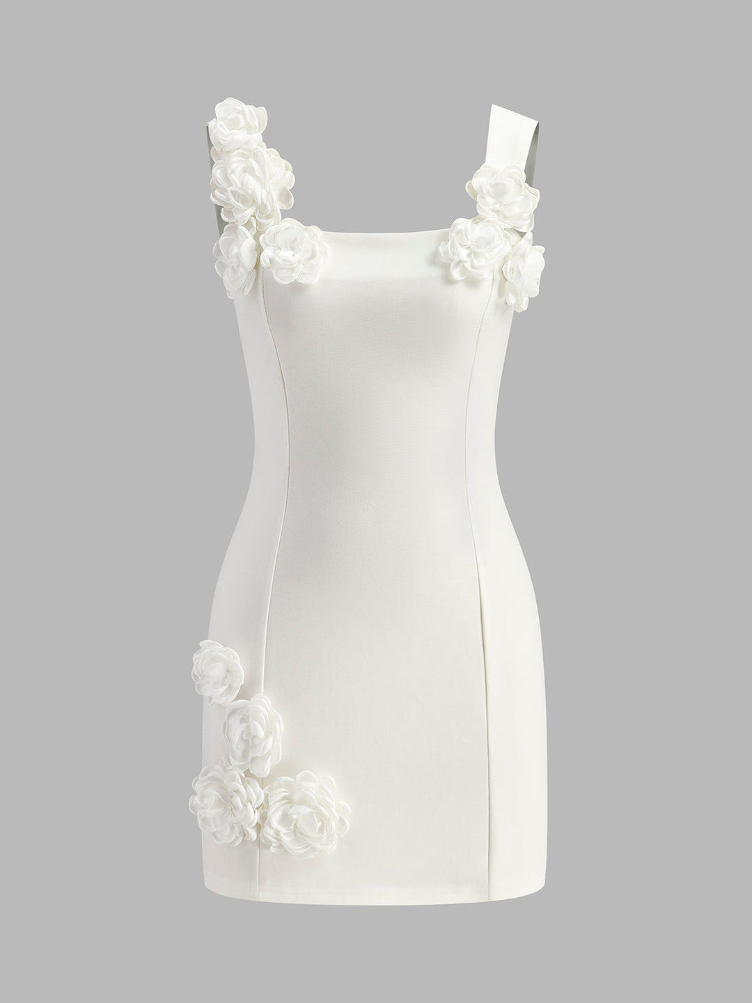 Çarpıcı 3D Çiçek Desenli Askılı Kısa Abiye Elbise Fermuar Detayıyla