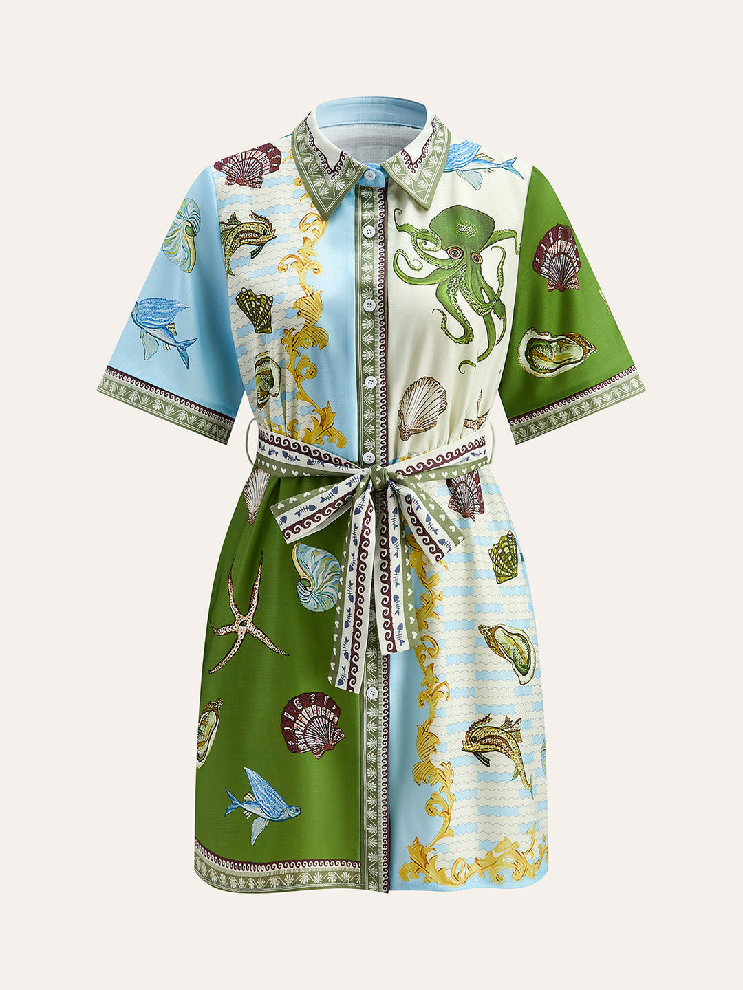 Şık Düğmeli Yaka Aqua Baskılı Gömlek ve Kemer