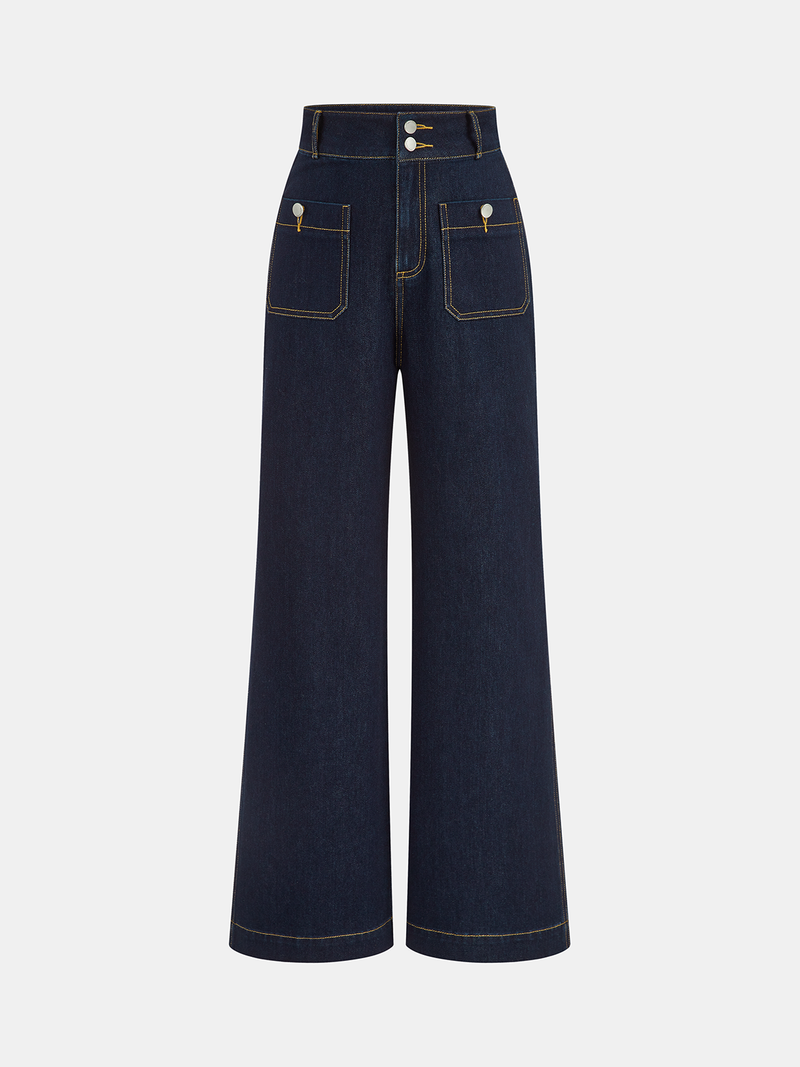 Yüksek Bel Çift Düğmeli Düz Paça Kot Pantolon