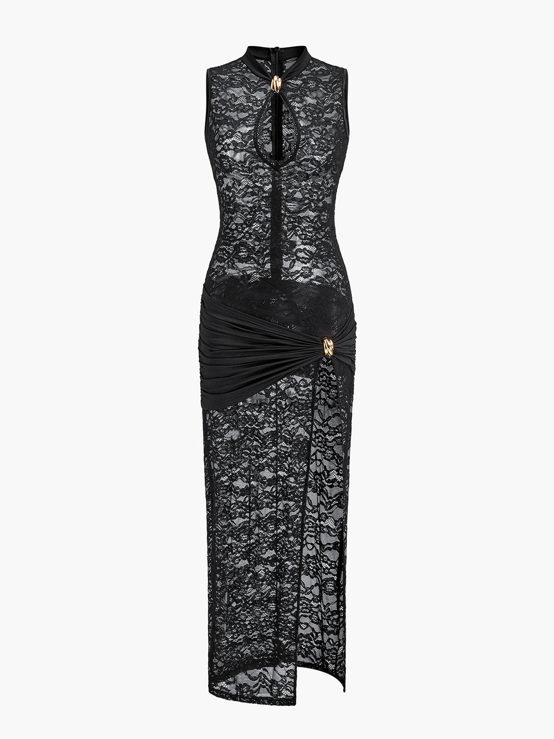 Şık Kırışık Tasarım Detaylı Zarif Şeffaf Dantel Anahtarlı Elbise