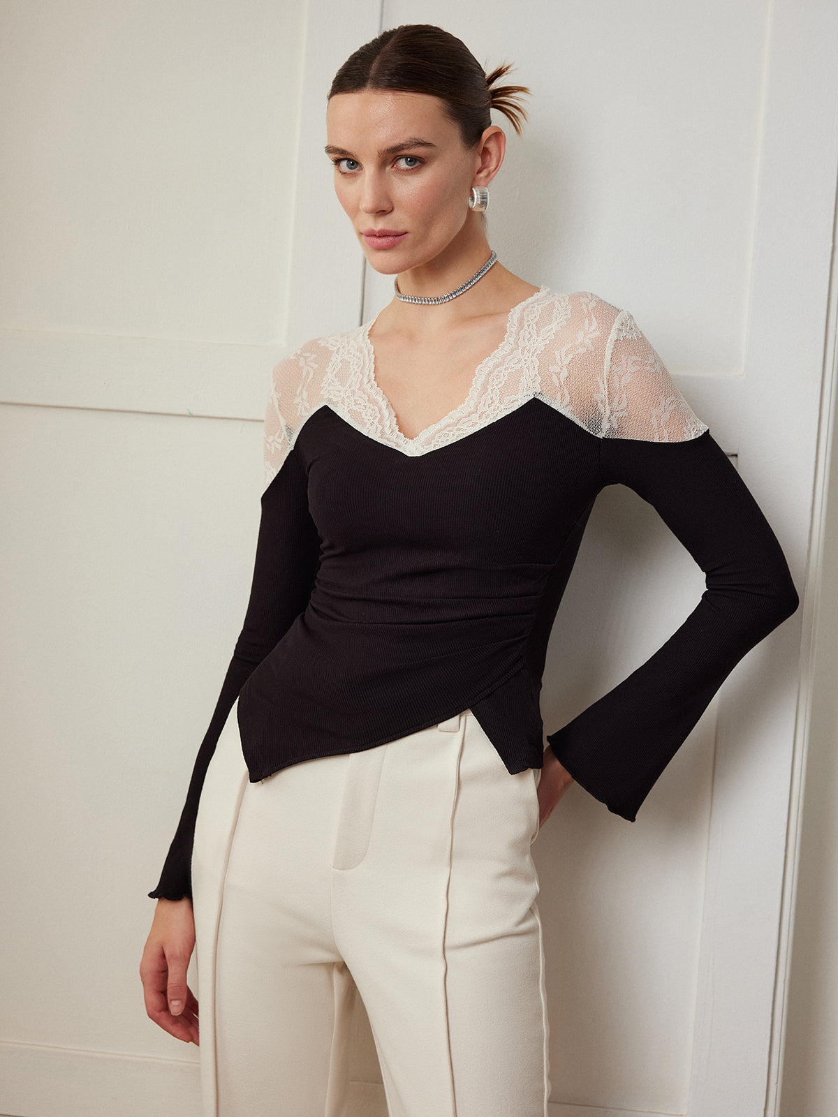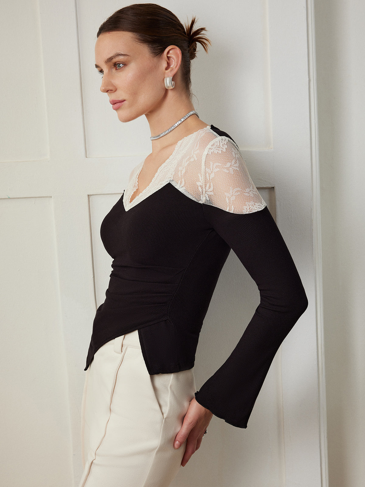 Şık Asimetrik Dar Bluz Zarif Dantel Panellerle